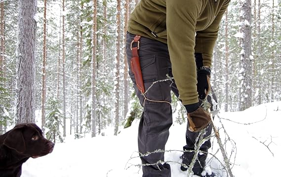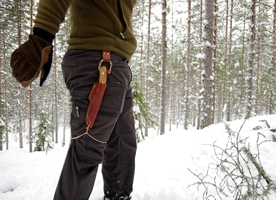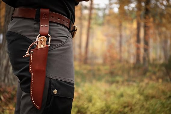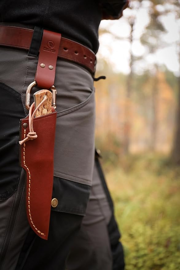 Casström’s No.3 Dangler is an ingenius accessory to let your knife hang further down from the waist, dangle freely so that you can move easily and make handling on and off the belt smoother. The specially designed D-ring carabiner can also be used for other tasks. Many of our customers have requested an extended belt loop, a “dangler” so that the knife can be easily accessed even when you have a jacket on or a large backpack with a hip belt. With a Dangler it also becomes easy to sit down without the knife getting in the way. When the pouch or sheath hangs it can be bent at the height of the hip joint which allows the knife to smoothly follow your legs movement – you can run, climb and bend almost without noticing the knife. We have also designed the D-ring as a carabiner and thus opened up many new features and applications. You can easily take the knife off without having to open your belt, you can easily move the knife to your backpack for example, or just quickly take it off if you are approaching a populated area. The D-ring is made of sturdy 8mm thick aluminum and in tests the breaking strength has exeeded 400kg which means that you can use it for lots of different purposes, for example to hang up the equipment, pull an animal or anchor a dog leash to your waist. It can also be used for suspending a tarp or hammocks. Note that the D-ring should not be used for climbing since a bad fall can create forces that exceed 400kg even if the person is not heavy. The belt loop is made of sturdy 3mm thick vegetable tanned cowhide available in Cognac Brown, Black or Dark brown. The loop can take belts with a width up to 2 1/4″. The Dangler’s D-ring will take knife sheaths with a belt loop up to 1 3/8″ wide.